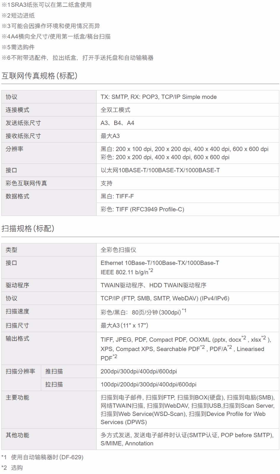 基本功能:含自动输稿器,两纸盒,彩色双面打印、复印、扫描,可扫描到电子邮箱、电脑文件夹和U盘,支持手机等移动设备的打印和扫描(需在WiFi环境下)等功能
